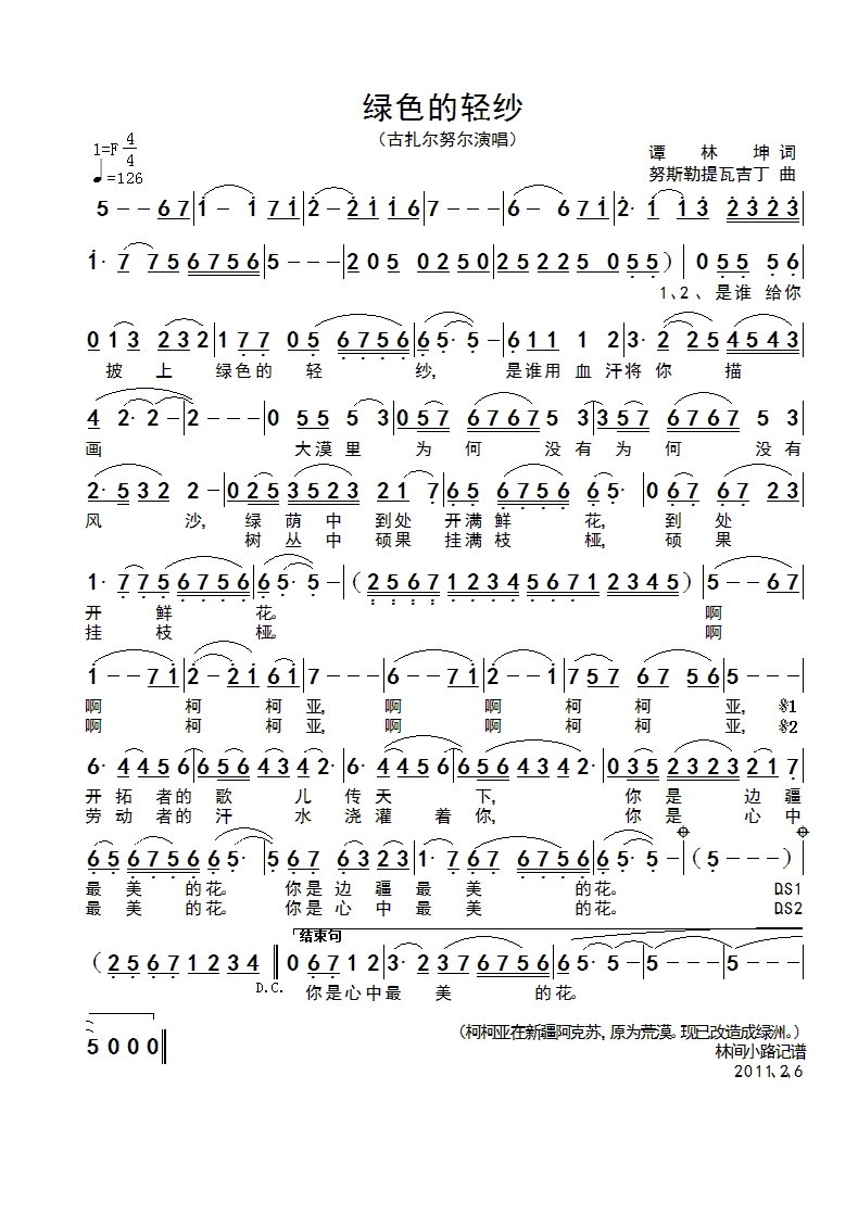 [五字歌譜]綠色的輕紗 古扎爾努爾
