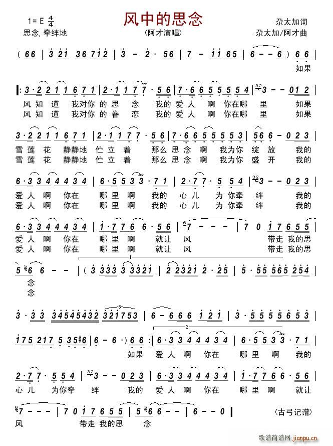 [五字歌譜]風(fēng)中的思念簡譜 阿才