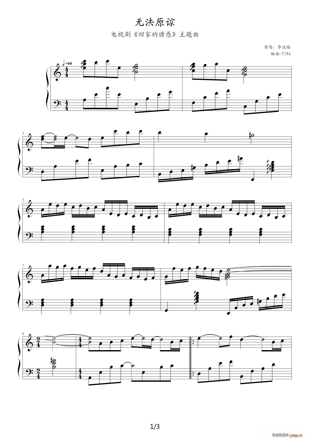 [鋼琴譜]無法原諒(電視劇《回家的誘惑》主題曲) 李佳璐
