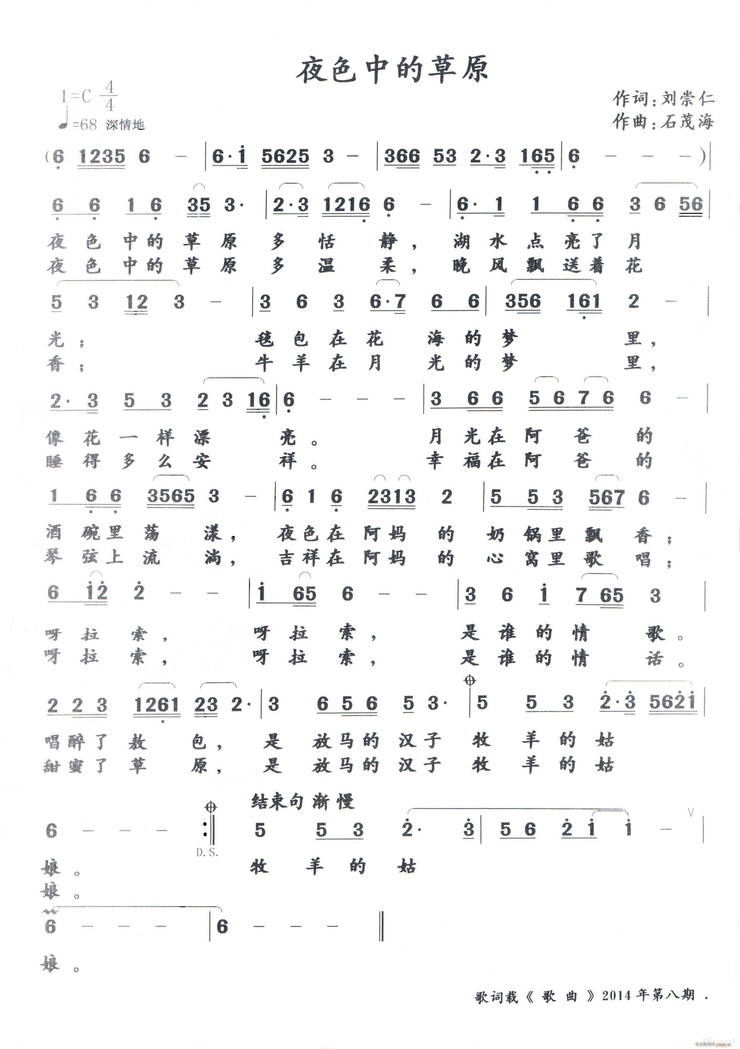 [十字及以上]《 夜色中的草原 》 作詞 劉崇仁 作曲 石茂海 學(xué)寫(xiě)草原歌曲 請(qǐng)老師指教